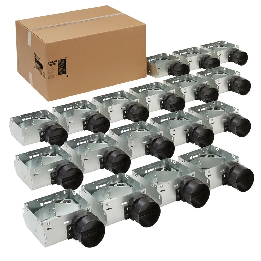 Project packs are ideal for contractors and builders who have yet to pick out the final product. With the housing for the fan sold separately from the grille and motor, contractors are able to continue with construction and not have to worry about damaging, losing or storing the product. Once all construction is complete, the purchase of a finish pack (grilles and motor/blower wheels) can be made to add the finishing touches to the room. The 6884H housing pack consists of 18 housings with 4” duct connectors attached. Pair it with the 1688F, 1671F, E0F70, 696RNB or 696RB finish packs to create 4” ducted economy fans. Note: Three finish packs will need to be purchased to supplement one 6884H, as the finish packs come as 6-packs, and the 6884H is an 18-pack.