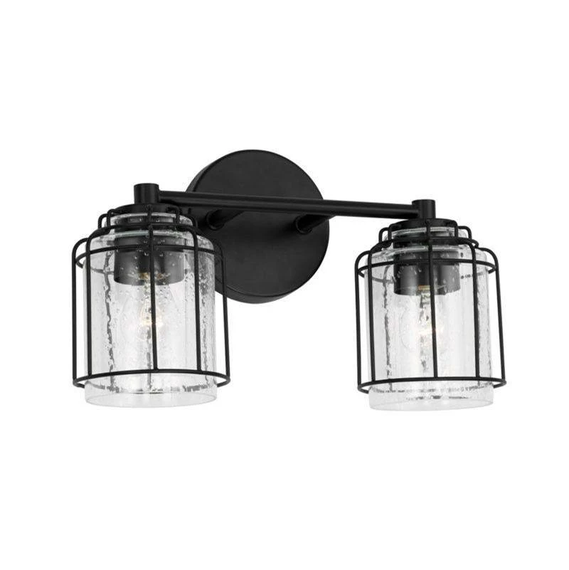 Inspired by a vintage walking lantern, the Harmon 2-Light Vanity evokes farmhouse flair. The seeded glass shades complement the cage silhouette in a Matte Black finish for a style that will stand the test of time.