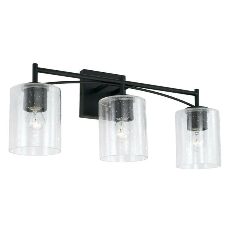The sharp lines and artistic arches of the Peyton 3-Light Vanity give a modern update to old world influence. The muted tone of the Matte Black finish allows the seeded glass shade to take center stage.