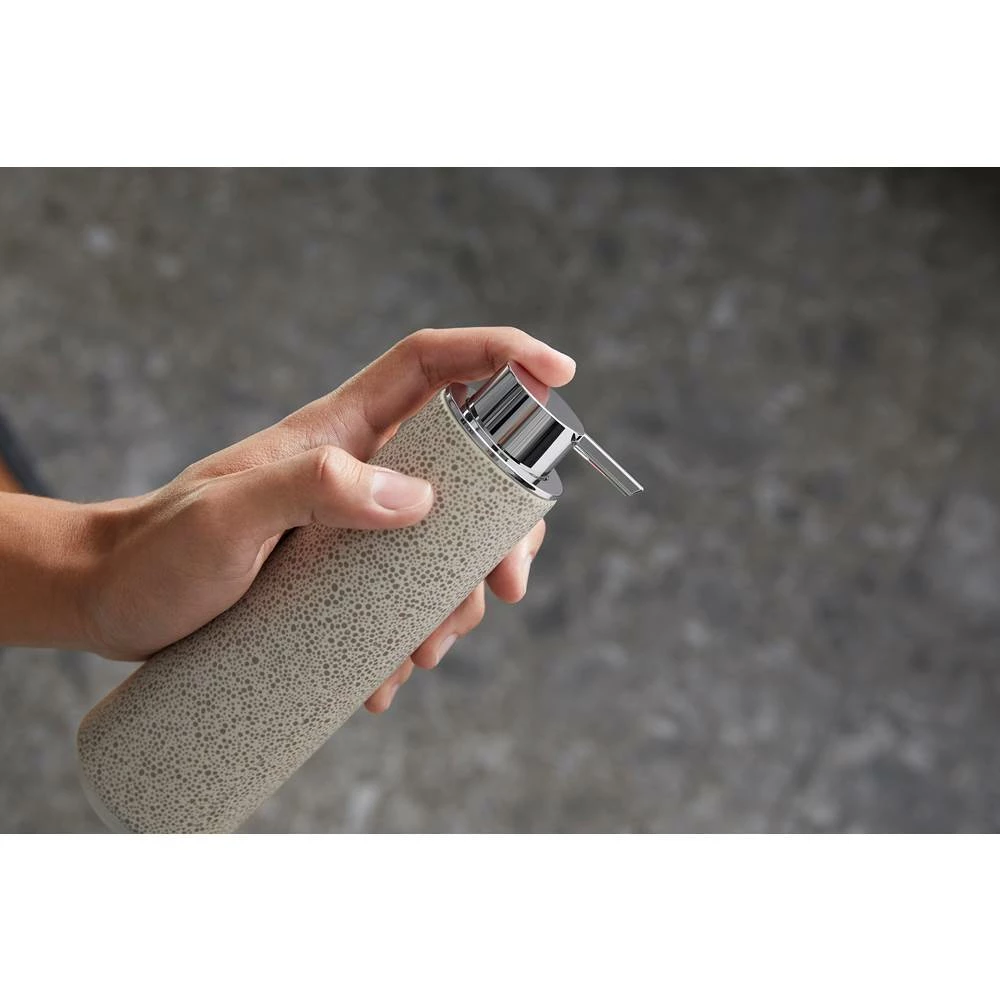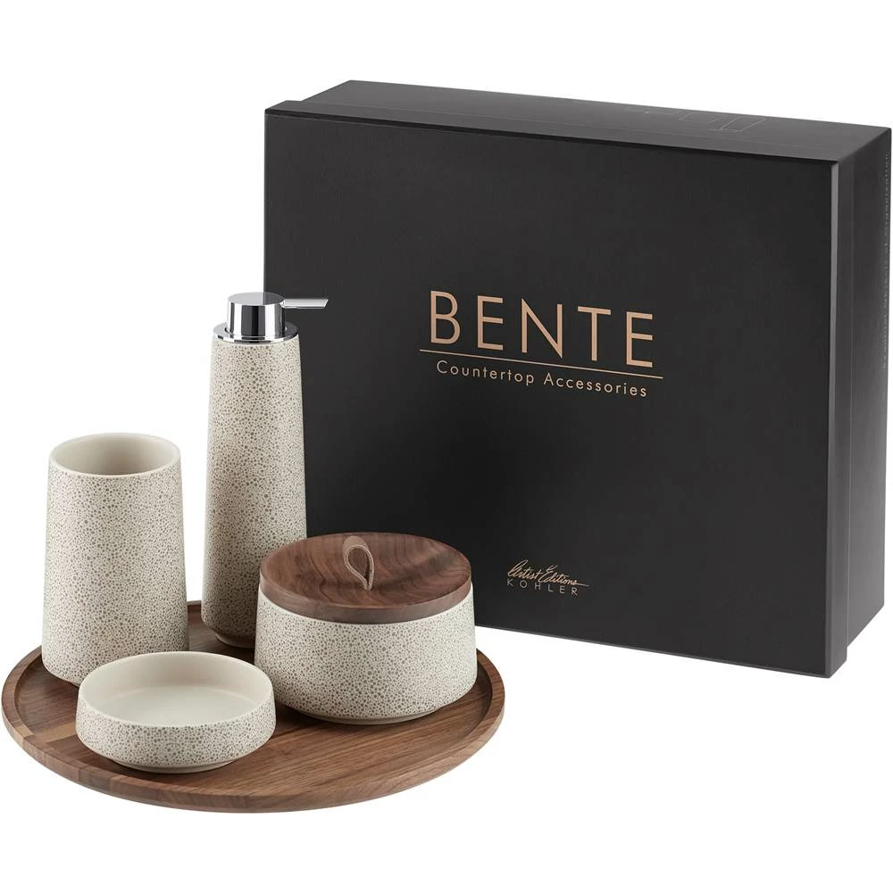 This Artist Editions Bente accessory collection enhances the beauty and organization of the bathroom countertop space. This five-piece set includes a ceramic soap dispenser, tumbler, lidded canister, soap dish and wooden tray. Each piece was thoughtfully designed to nest together on the wooden tray or be used individually in a multitude of spaces throughout the home. Unique material elements and finishes are beautifully incorporated into the collection. The Shagreen Oyster Pearl pattern celebrates the subtle coloring and distinctive pebbled texture of natural shark and ray leather. Delight in the details of your home with Kohler.