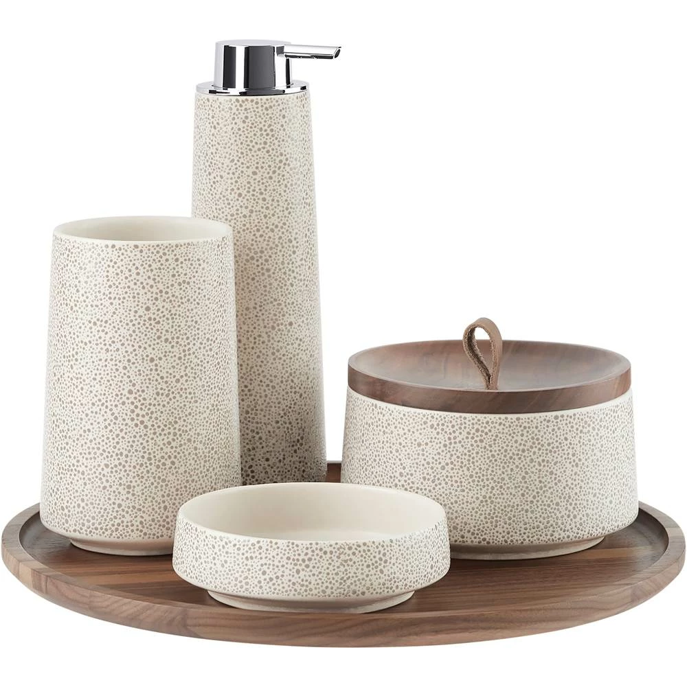 - Five-piece set contains a ceramic soap dispenser, tumbler, lidded canister, soap dish and wooden nesting tray