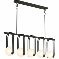 - Globular glass shades are gracefully suspended from curved metal bases in artist-inspired arrangements