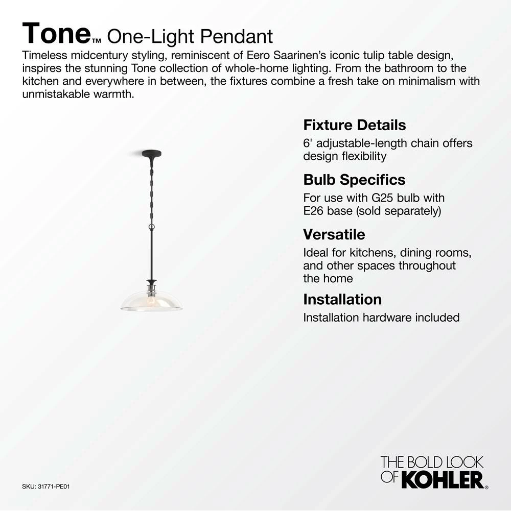 With domed, clear-glass shades, mixed-metal trumpet bases, and intersecting rod supports, the Tone lighting collection delivers a fresh take on midcentury modern style. Blending minimalism, warmth, and thoughtful functionality, Tone lighting fixtures are versatile enough for any space in your home. These contemporary pieces were created to complement the KOHLER Tone faucet collection for a cohesive home design.