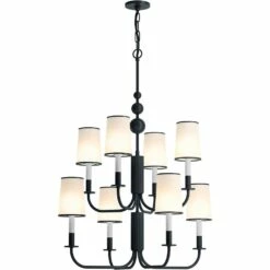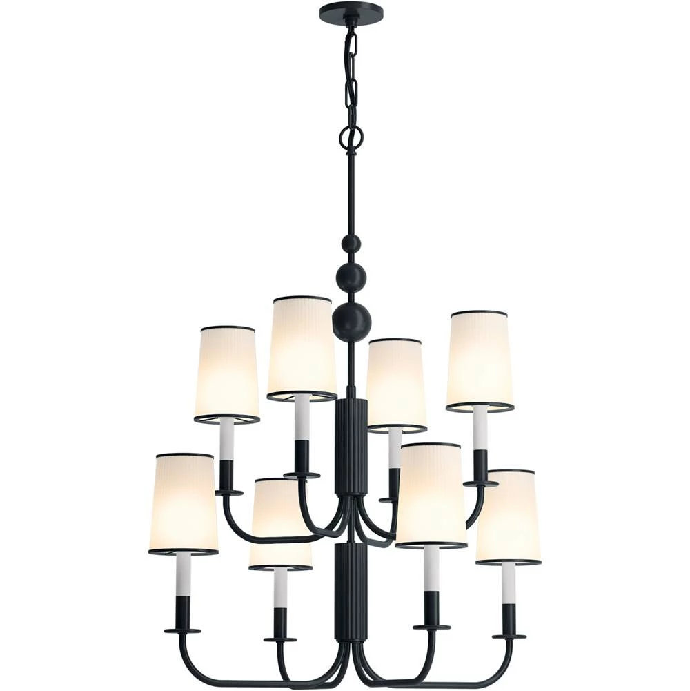 - Scalloped metal center with orb accents is surrounded by candlestick fixtures and delicate matte ribbed glass shades for dramatic elegance